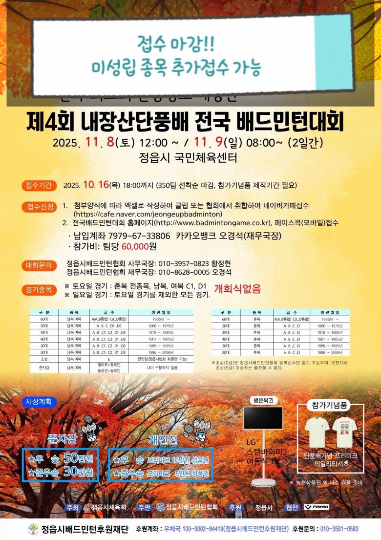 | 대회요강 | 제4회 내장산단풍배 전국 배드민턴대회요강.pdf | |
