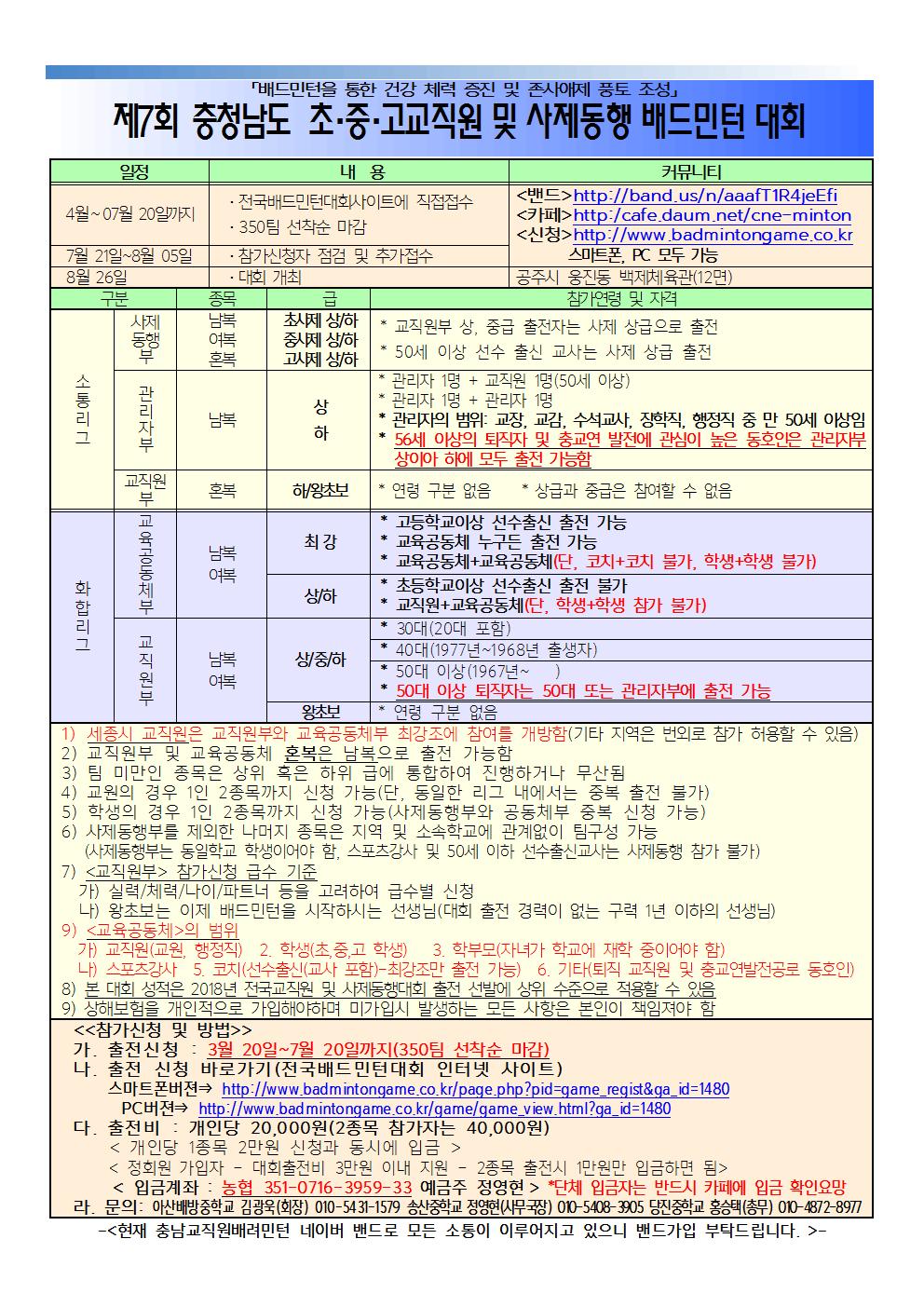 자세한 요강은 충남교직원배려민턴밴드 또는 충청남도교직원배려민턴연합회 카페에 나와 있습니다.